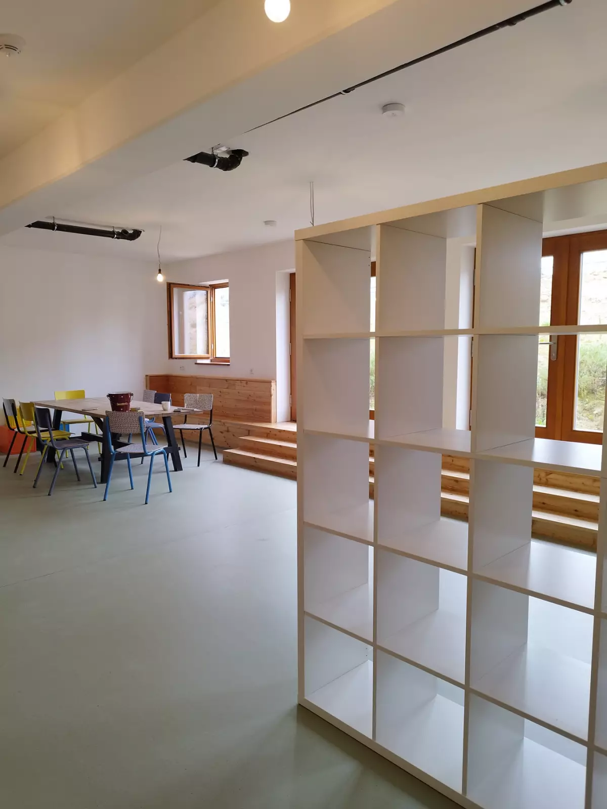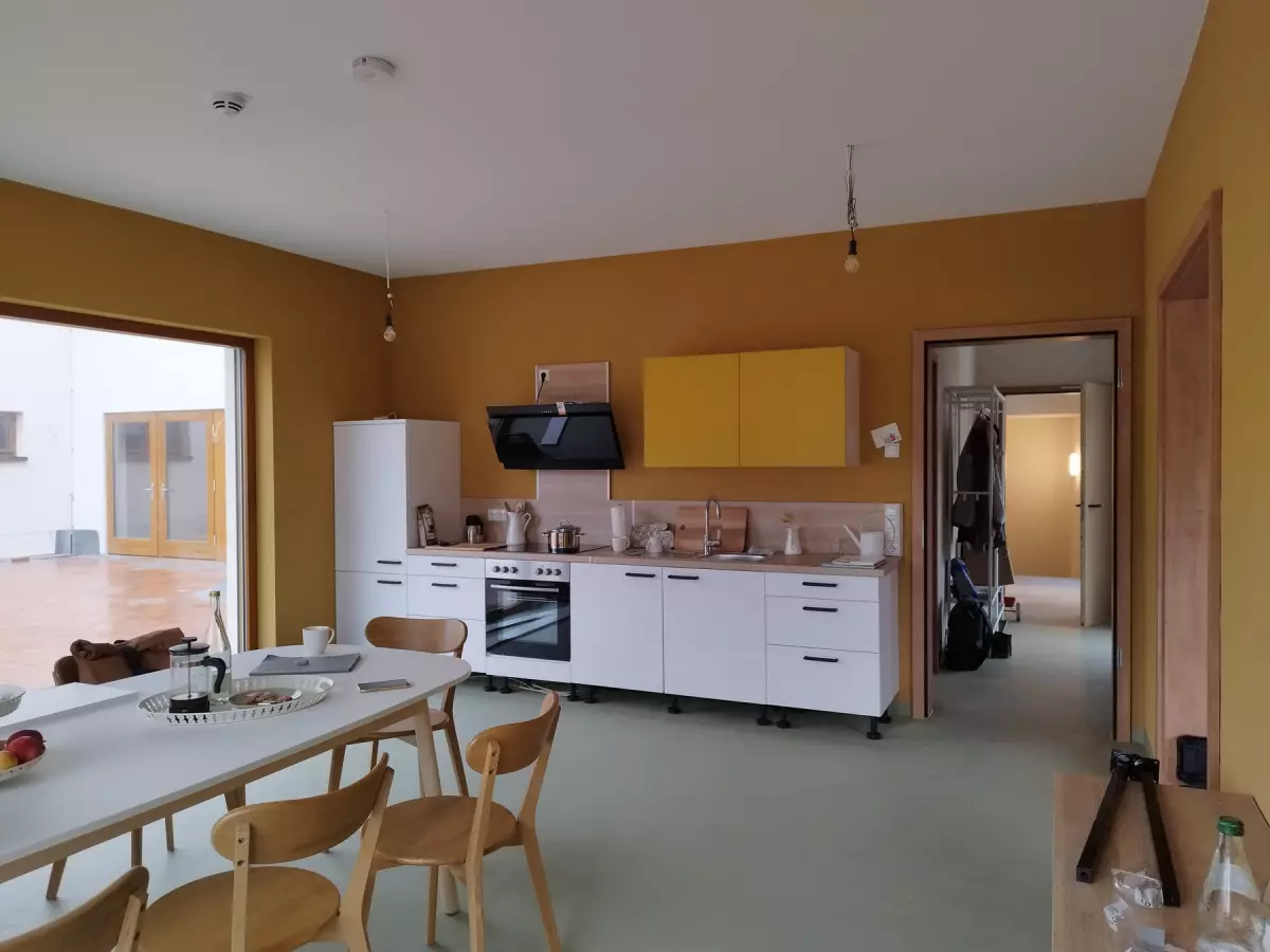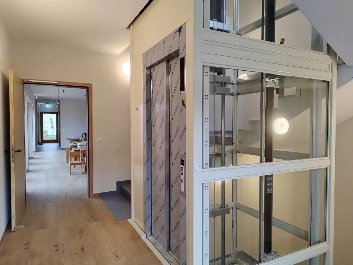 Der Kindergarten ist barrierefrei und besteht aus 3 Etagen, die über einen Aufzug verbunden sind. Die Räume unterscheiden sich in Farben und Texturen und können so leicht von Kindern erkannt werden, Beläge und Oberflächen sind in natürlichen Materialien gehalten.