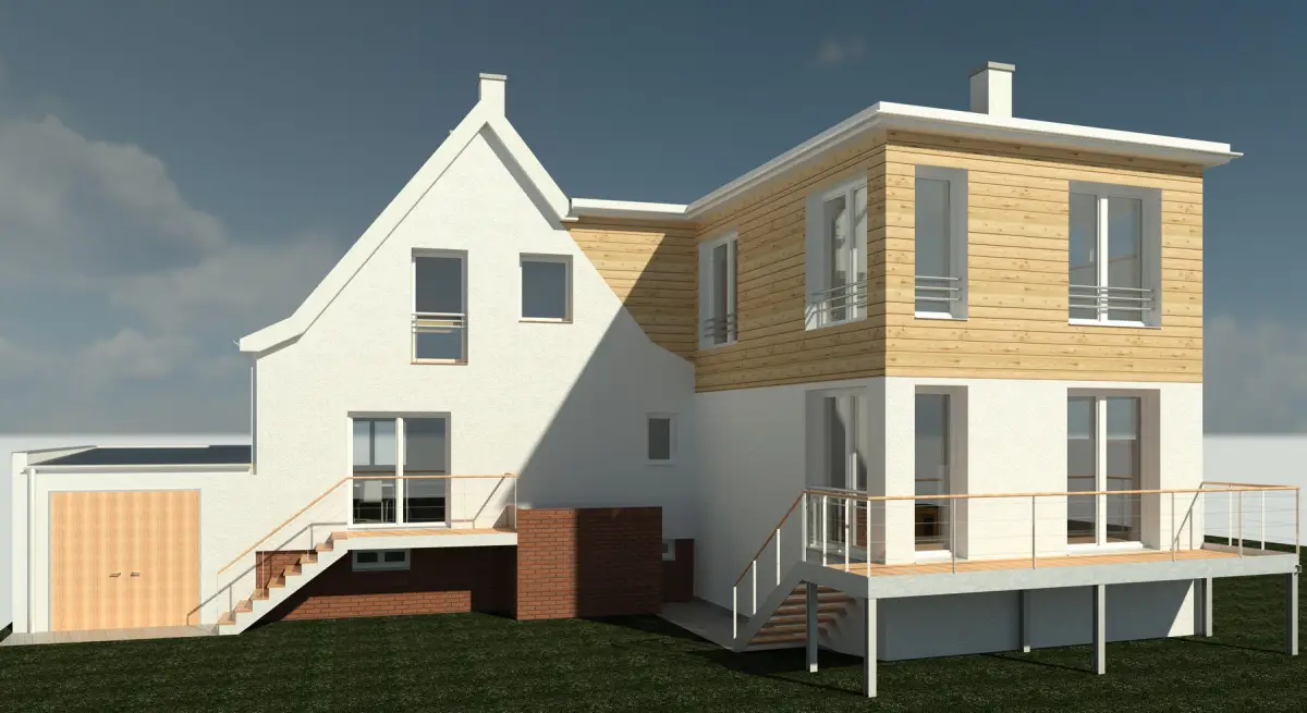 Um den Charme des alten Hauses zu erhalten und ein Gleichgewicht zwischen alt und neu zu erhalten haben wir einen zweigeschossigen Anbau mit eigener Formensprache seitlich des Bestandes geplant, der die Eigenständigkeit des Bestandes betont und die Giebelfelder freistellt.