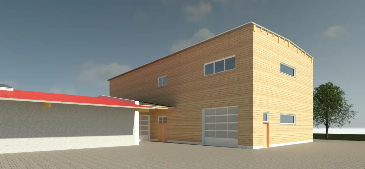 Neu zu schaffen waren Lager- und Produktionsflächen als auch eine überdeckte Lade- und Lieferzone. Dafür wurde eine neue, zweigeschossige Holzkonstruktion geplant, die über eine Brandwand mit dem Bestand verbunden ist. Produktionsflächen sind ebenerdig vorgesehen, Lagerflächen im Obergeschoss, der vertikale Transport erfolgt mit einer neuen Hebebühne für Lasten.