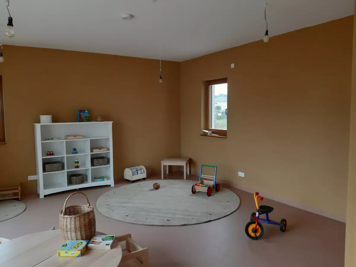 Der Kindergarten ist barrierefrei und besteht aus 3 Etagen, die über einen Aufzug verbunden sind. Die Räume unterscheiden sich in Farben und Texturen und können so leicht von Kindern erkannt werden, Beläge und Oberflächen sind in natürlichen Materialien gehalten.