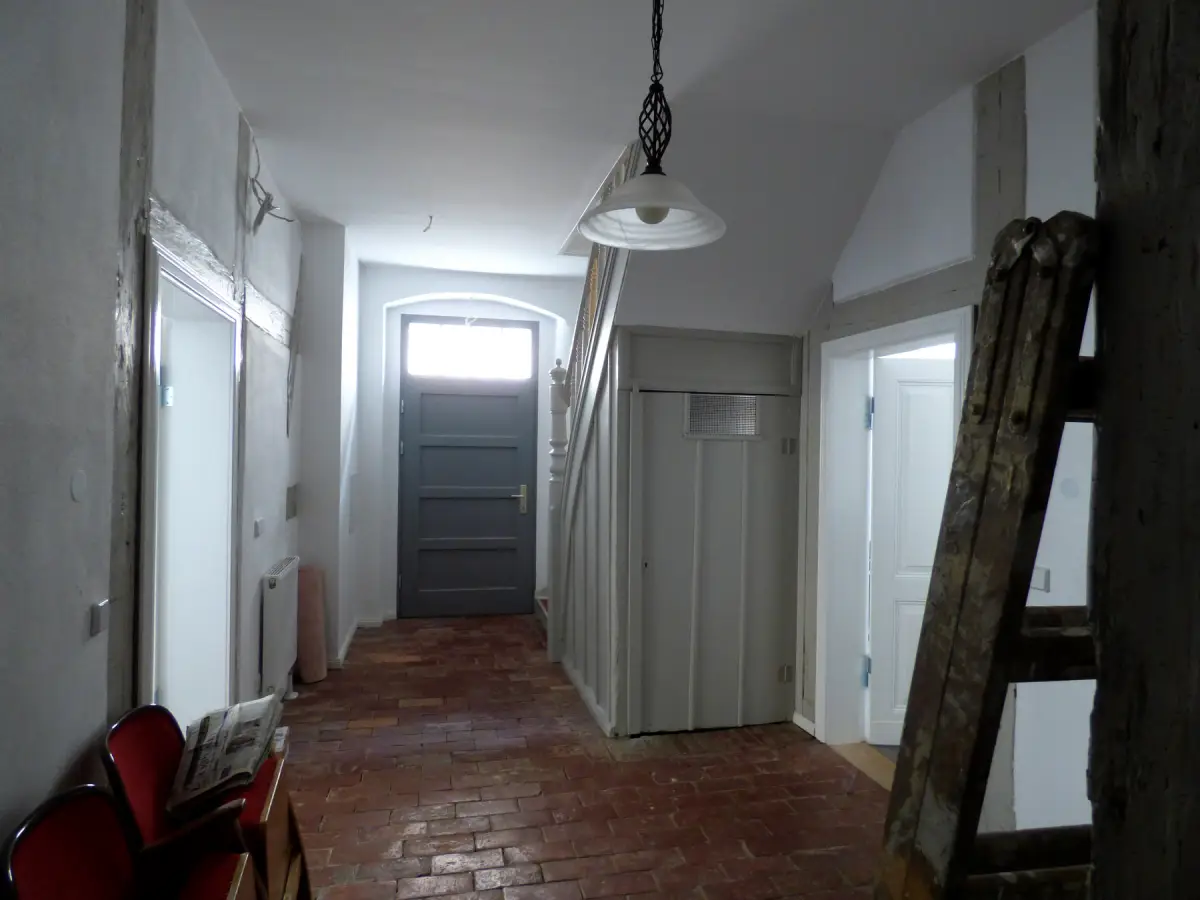 Das umzubauende und vollständig instand zu setzende Stadthaus hat als denkmalpflegerische Besonderheit 4 schwarze Küchen, von der Fachwerkkonstruktion sind nur noch Reste vorhanden, es besteht Einsturzgefahr.